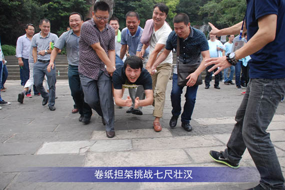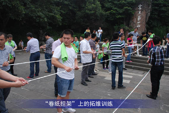一筒卷紙能承受住一位成年人重力?你會相信嗎?你不得不信,這種不可思議事情就發(fā)生在我們團隊上,每個團隊(duì)展開薄薄(báo)的卷紙,並齊心協力扭成麻花狀,一根根(gēn)細條卷紙交錯串聯起,匯聚起每位隊員的力量。牢固的繩索加上隊友默契的配合,老師分配的任(rèn)務(wù),一會兒的功夫,我們的團隊就順(shùn)利完成。這個小小的拓維訓練告訴(sù)我(wǒ)們,看似不(bú)可完成的任務,隻要團隊上下齊心,有信心(xīn),發揮團隊作戰力量就能戰勝一切。